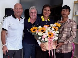 On Sokheng’s last day we had a presentation of flowers from the Cambodian Board, a letter read out from the NI Board and a presentation of photos showing what Sokheng has achieved during all her years with us. The children had cake and ice-cream. We had a staff dinner after Sokheng’s last day, at which I tried chicken feet for the first and last time!!